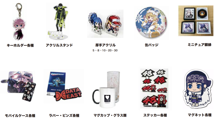 | 事業内容 | アニメや、ゲームなどを中心とした受託製造 企業販促物の受託製造 オリジナルアイテムの企画デザイン |